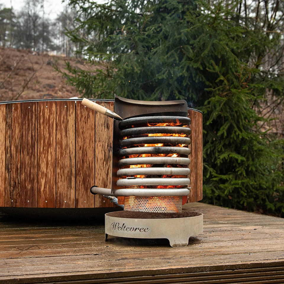 Dutchtub Wood as schaal voor plaatsing onder de spiraal kachel.