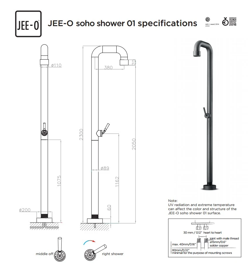 De JEE-O soho shower 01 is een vrijstaande douche, beschikbaar als buitendouche maar kan ook voor in de badkamer. Een prachtige designdouche die in elk industrieel interieur en exterieur past. De JEE-O soho shower 01 is ontworpen in samenwerking met de Amsterdamse design studio Grand & Johnson. JEE-O heeft met deze douche reeds tweemaal in de prijzen gevallen. Deze Soho Shower heeft een RedDot design prijs in 2014 en een German design prijs in 2016 gewonnen.