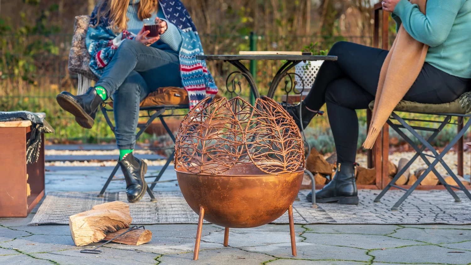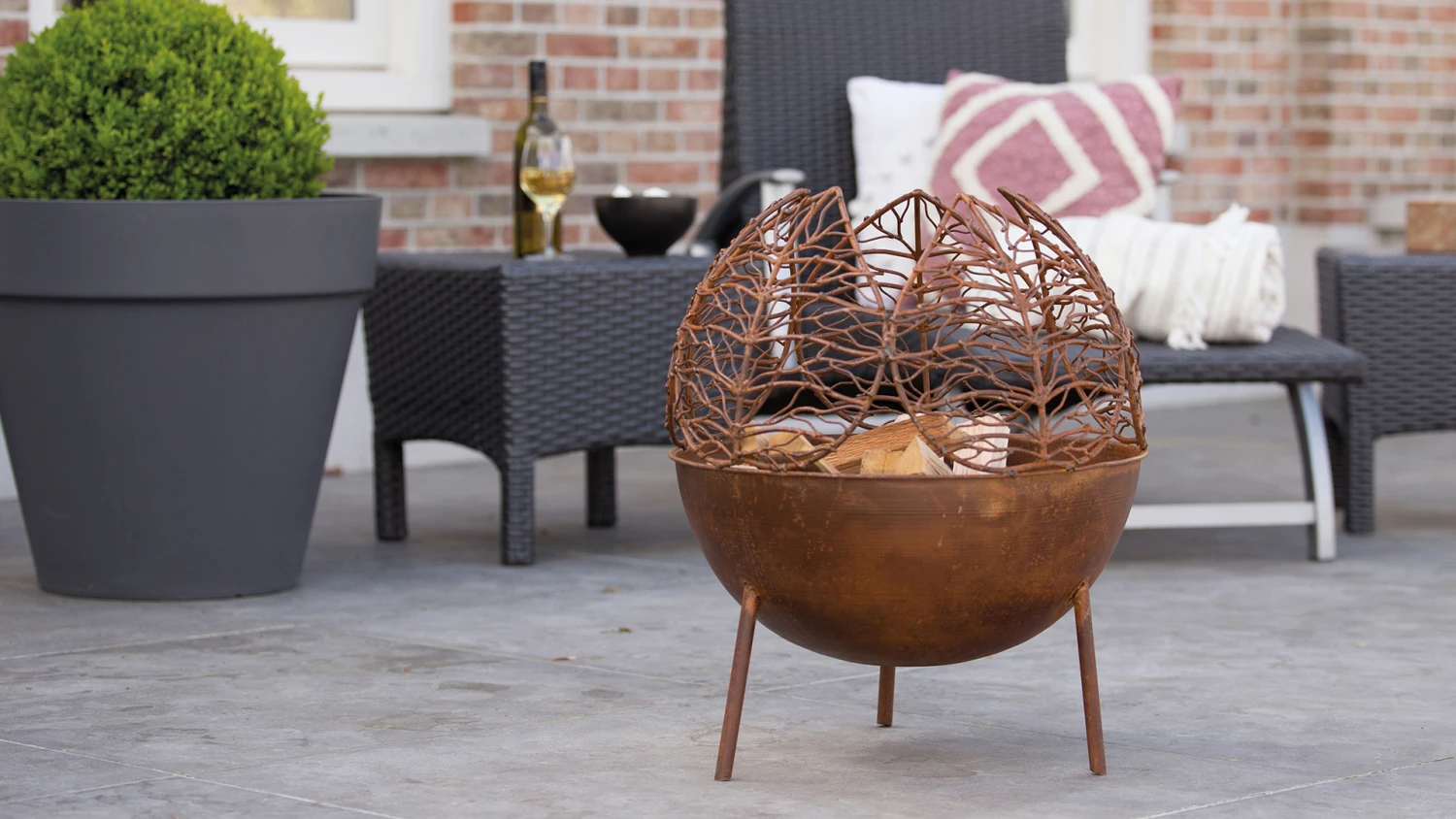 Handgemaakte Narfi Vuurbol in staal die natuurlijk roest. De bladvormige metalen zijkanten zorgen voor een prachtig design en een wondermooi lichtspel in het donker.